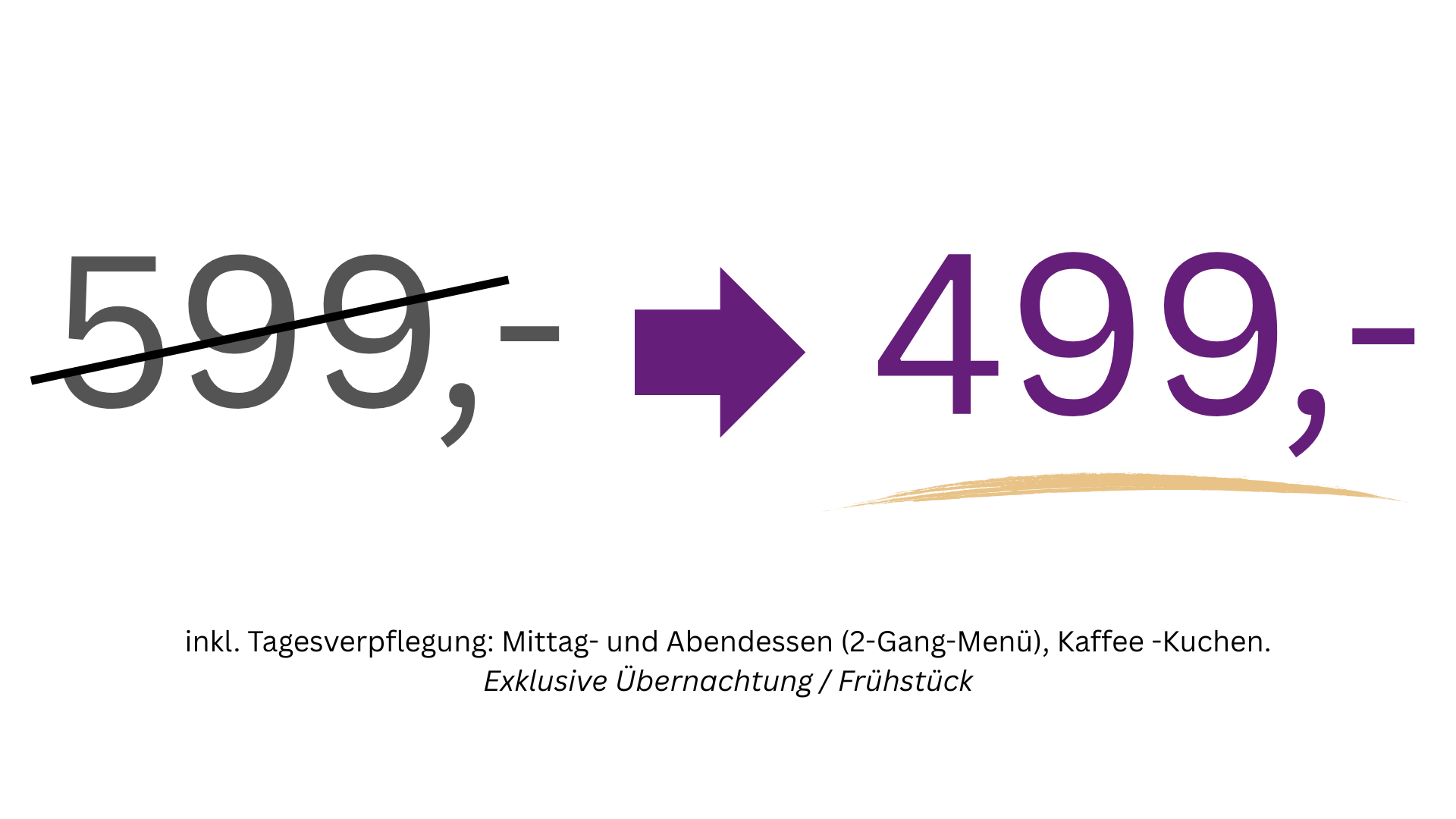 Der Preis - exklusive Übernachtung - beinhaltet die Teilnahme am gesamten Programm, alle Materialien & besondere Extras. Inklusive ist: Tagesverpflegung (Mittag-, Abendessen | Stehkaffe | Snacks | Getränke während der Workshops). Die Übernachtung/Frühstück ist selbst zu buchen.
